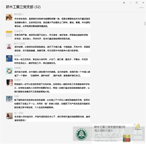 党支部其他同学也纷纷谈了认识和感想,并分享了近期学习和身体情况,一致认为在疫情防控期间要以身作则,以大局为重、以国家为先,为战“疫”添能量、当示范、做贡献。相信通过共同努力,春天必定会到来!