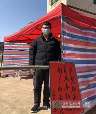 这位正在认真站岗的男生叫刘源松,是研木工第二党支部的一名党员,家住江西省赣州市虎石村。自疫情爆发以来,刘源松同志在结膜炎还未完全痊愈的时候便主动请缨参与到村口疫情防控工作,在早上八点之前便赶到村口去站岗,主要工作包括防止外村人员的进入,以及对村里进出的车辆和人员进行检查登记。正是一个个主动积极的党员的严格排查和监督,该村没有一例疑似案例。刘源松同志一直谨记自己的党员身份,在身体不适的情况下仍然用实际行动参与到疫情防控工作中来,真正地发挥了党员在基层组织中的优秀带头作用。