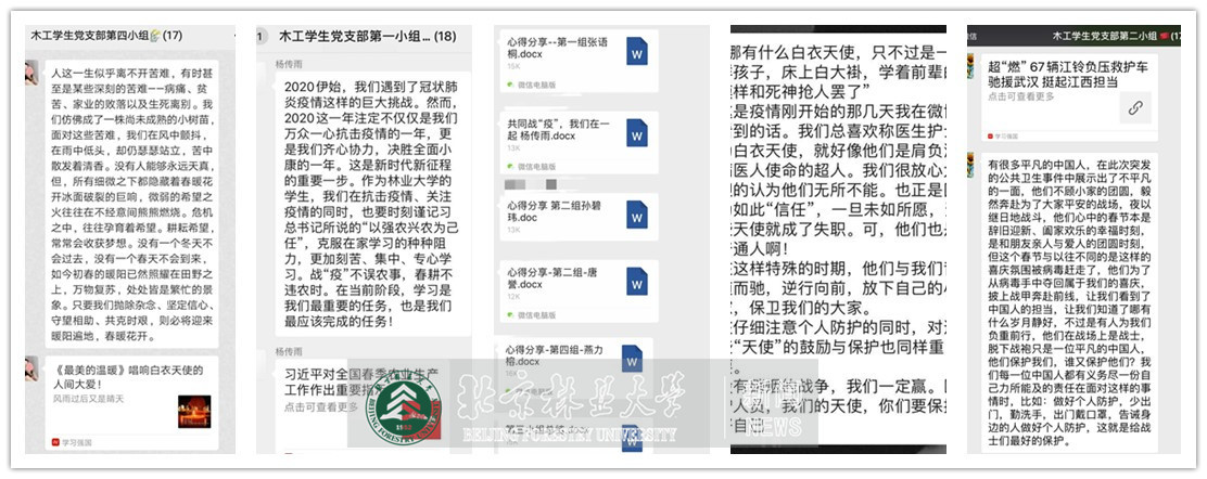 “积力之所举,则无不胜也”,当前正值全国战“疫”关键期,为充分发挥党支部战斗堡垒作用和党员先锋模范作用,木工学生党支部采用线上形式,开展关于中央部署、科学防疫、关键时期发挥作用的专题打卡学习。支部成员以党小组为单位,通过学习强国等平台进行相关文件的学习,以党小组两日打卡的方式互相监督进行线上学习,组内交流学习心得,推选一至两名优秀发言人在支部群进行总结分享。