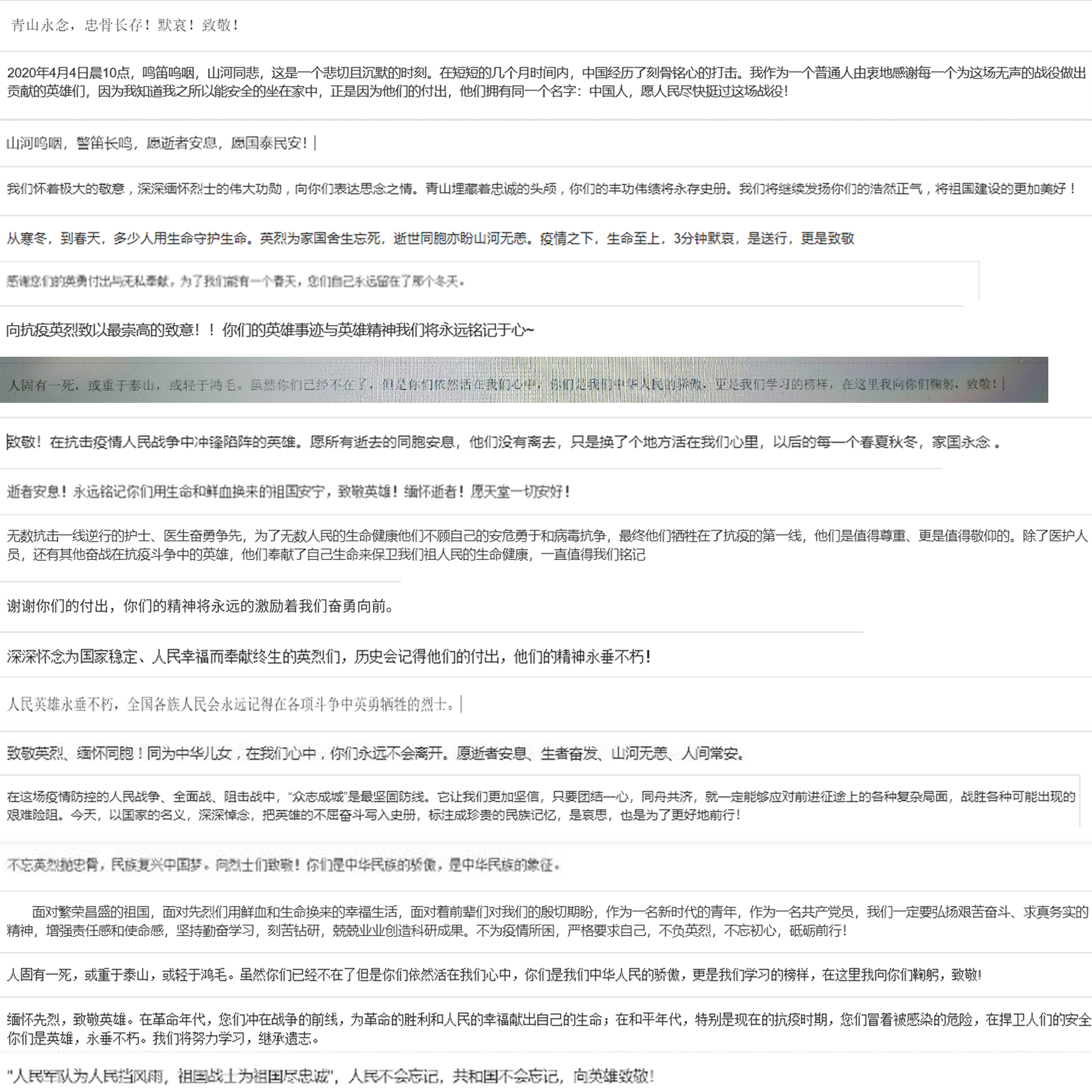 4日上午10时,鸣声响起,支部成员随全国人民一同默哀3分钟,向新冠肺炎疫情牺牲烈士表以崇高敬意和深切缅怀。