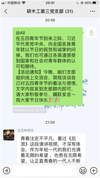 为纪念五四运动101周年,引导和激励新时代青年发扬以爱国主义为核心的五四精神,5月4日晚,材料学院研木工第三党支部举行五四青年节线上交流会,全员参与讨论。