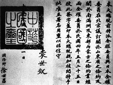 1915年1月18日,日本驻华公使日置益违反正常的外交途径,在与袁世凯私人会晤之时,提交了几页印有兵舰和机关枪水印的纸写文件,并要求袁“绝对保密,否则要负一切严重后果之责”。文件内容,便是把中国交到日本掌控之中的“二十一条”。