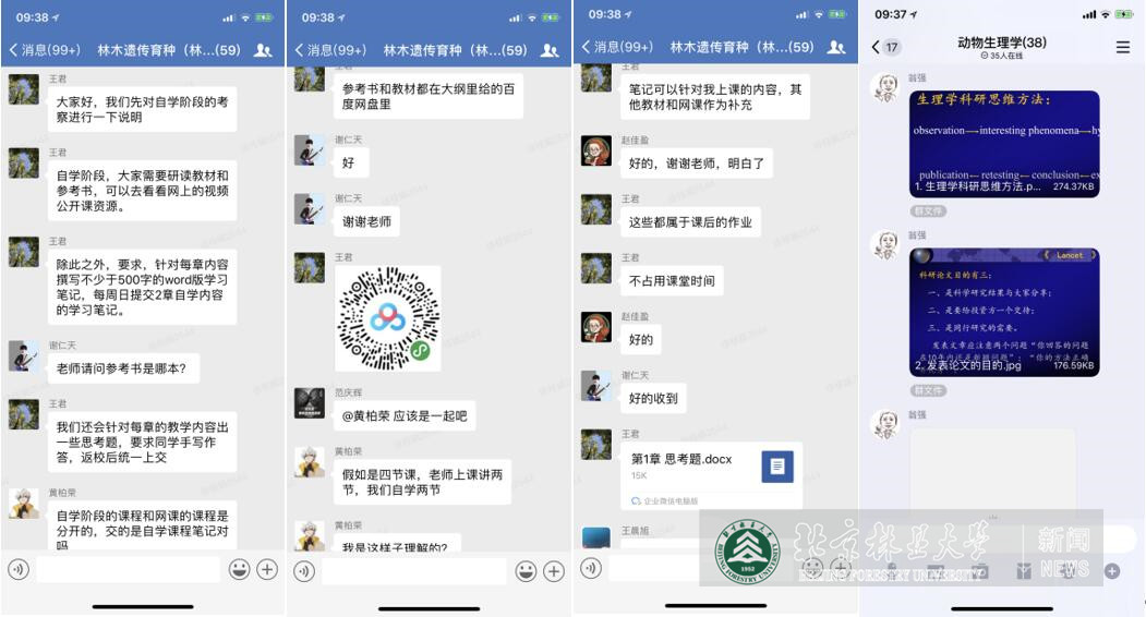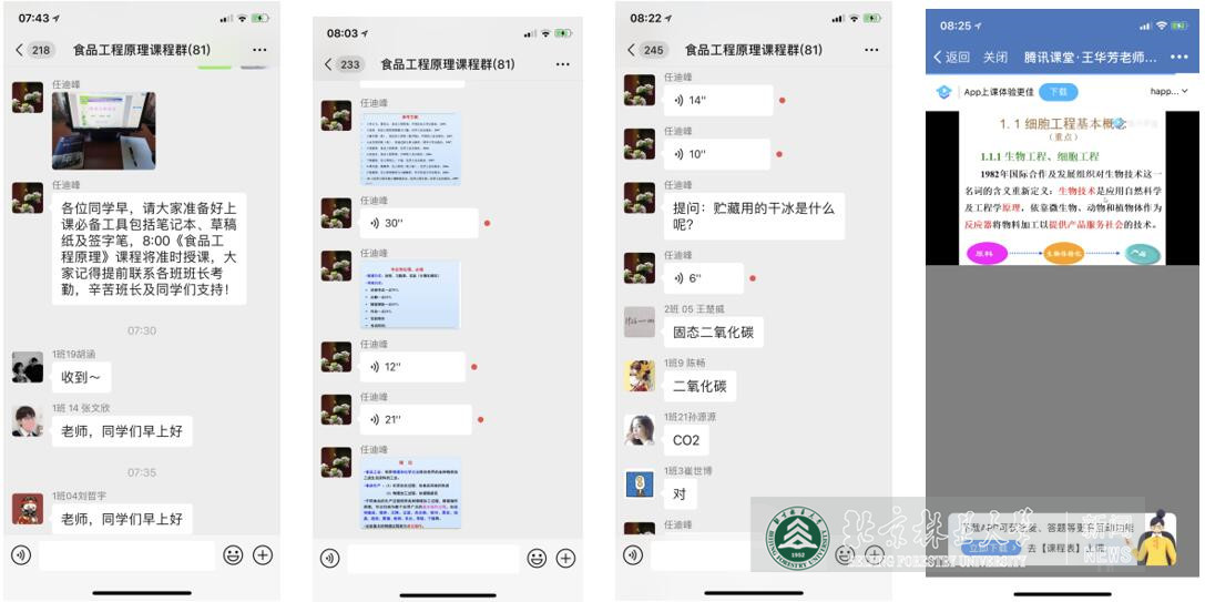 精心讲授,经受考验,做最完美的课堂。生物学院在17日早上8点开课的5门课程中,有3门课程通过企业微信群进入腾讯课堂授课,1门课程通过微信群语音授课,1门课程通过QQ群语音授课。上午7点20分,北京市教学名师、北林榜样翁强等任课教师就早早打开电脑,提前上网再次测试网络及软件,组织学生进“课堂”。8点,5门课程准时上线,完美开局,大家经受住了考验,教师授课网络很顺畅,腾讯课堂中任课教师的PPT画面清晰,讲课声音清楚,没有杂音;微信群和QQ群授课也是声音清晰,形式多样。老师们在群里及时发布讲解的PPT,并与学生进行交流。课程中有提问有回答,有现场小测验,有课后作业,虽然学生们不能发声,但参与度极高,通过屏幕及时回应老师,反馈给老师自己的“答卷”,达到了类似于现场授课的课堂氛围。