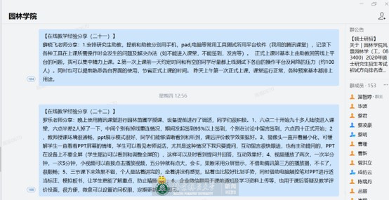 及时总结分析,优化线上教学方式。为确保课程的顺利进行,学院组建企业微信群、教研室主任企业微信群,开通学院本科线上教学视听平台,全面了解课程实时教学动态,形成全覆盖的线上教学网络联通体系;建立教师线上教学分享渠道,发布教师教学经验分享二十七篇,教学妙招层出不穷,园林学院教师殷炜达老师说:“在线课程的节奏很重要,类似于一场音乐会有起承转合,更完整的瞬时反馈机制会提升授课的效率”。袁涛老师说:“线上教学中学生的互动明显比教室上课要多,有的学生回答问题很幽默,活跃了课堂气氛。”