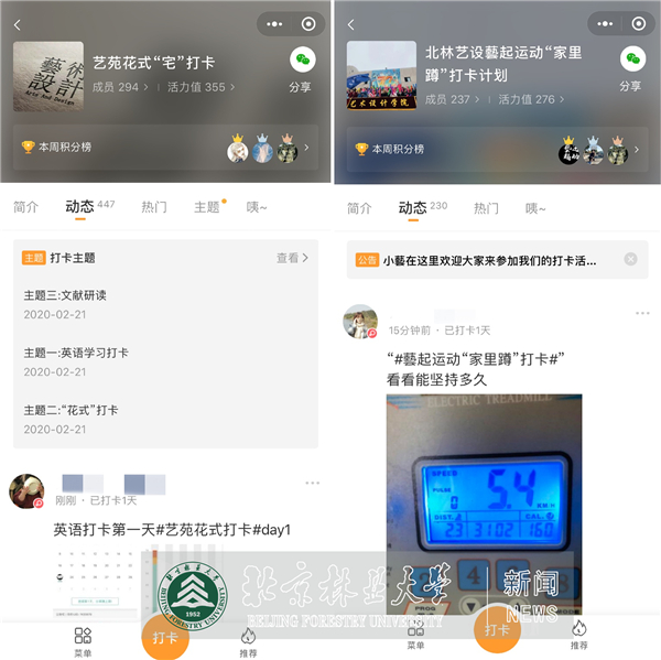 活动包括“21天花式打卡计划”和“艺起运动‘家里蹲’打卡计划”的系列线上活动。本次活动鼓励全院师生积极参与其中,活动开展三天时间,已有超过500名师生响应,其中,其他学院的学生也积极参与活动中。结合学生线上学习需求及艺术设计学院学生特点,“21天花式打卡计划”活动包括单词学习、绘画设计、读书分享、文献阅读等多种学习形式,帮助学生做好学习记录和学习分享,营造线上的学习氛围,除此之外,“花式打卡”还包括厨艺分享、手工编织等趣味性活动;“艺起运动‘家里蹲’打卡计划”则引导学生在家中完成健身塑形、减脂瘦身等多种类型的体育活动,同学们可以通过打卡截图、健身视频等形式分享运动精彩时刻,帮助学生保持运动量,提高免疫力,丰富课余生活。活动参与者还可以在打卡程序中看到其他人的打卡内容,构建了远程互动,共同进步的学习环境。