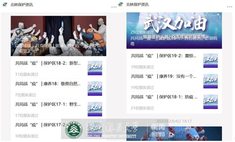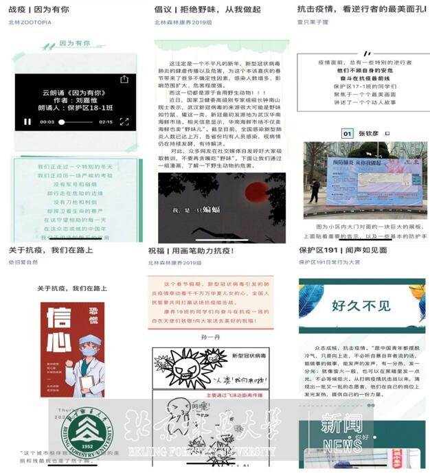 疫情防控期间,学院各团支部开展共同战“疫”主题教育及抗“疫”英雄分享会等7项活动。各支部积极行动,结合专业知识,投稿并发表防疫解答、野保科普等共同战“疫”推送20余篇;采用线上合作的形式,制作云朗诵、加油视频5篇,绘制原创海报6篇,书写祝福语30余篇,向奋战在前线的战士送上崇高的敬意与真挚的祝福;学生在居家期间以摄影、日记的形式记录生活体悟,积极思考,撰写并投稿疫情观察报告20篇。