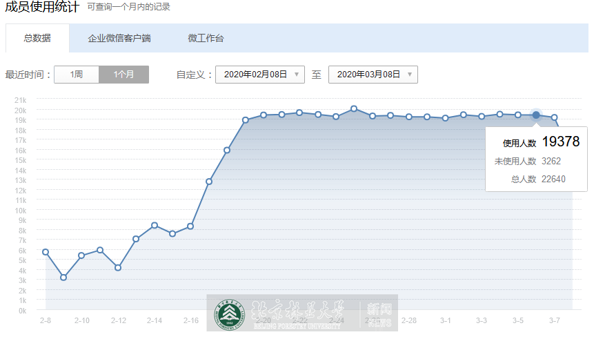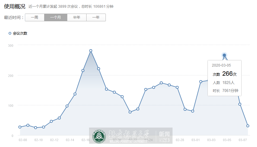 为方便远程办公,信息中心开通了企业微信视频会议服务,极大满足了学校疫情防控工作中快速便捷的会议沟通需要。当前,学校多个部门已经开始使用,师生累计发起会议3944次,总时长102083分钟。