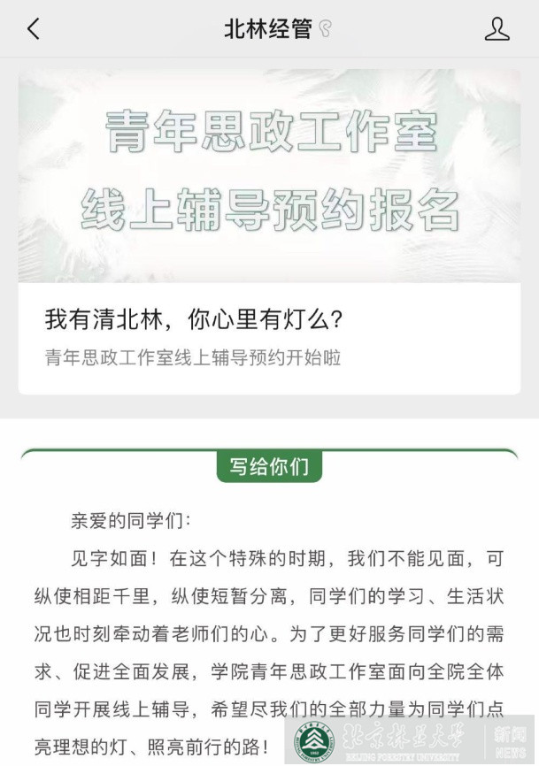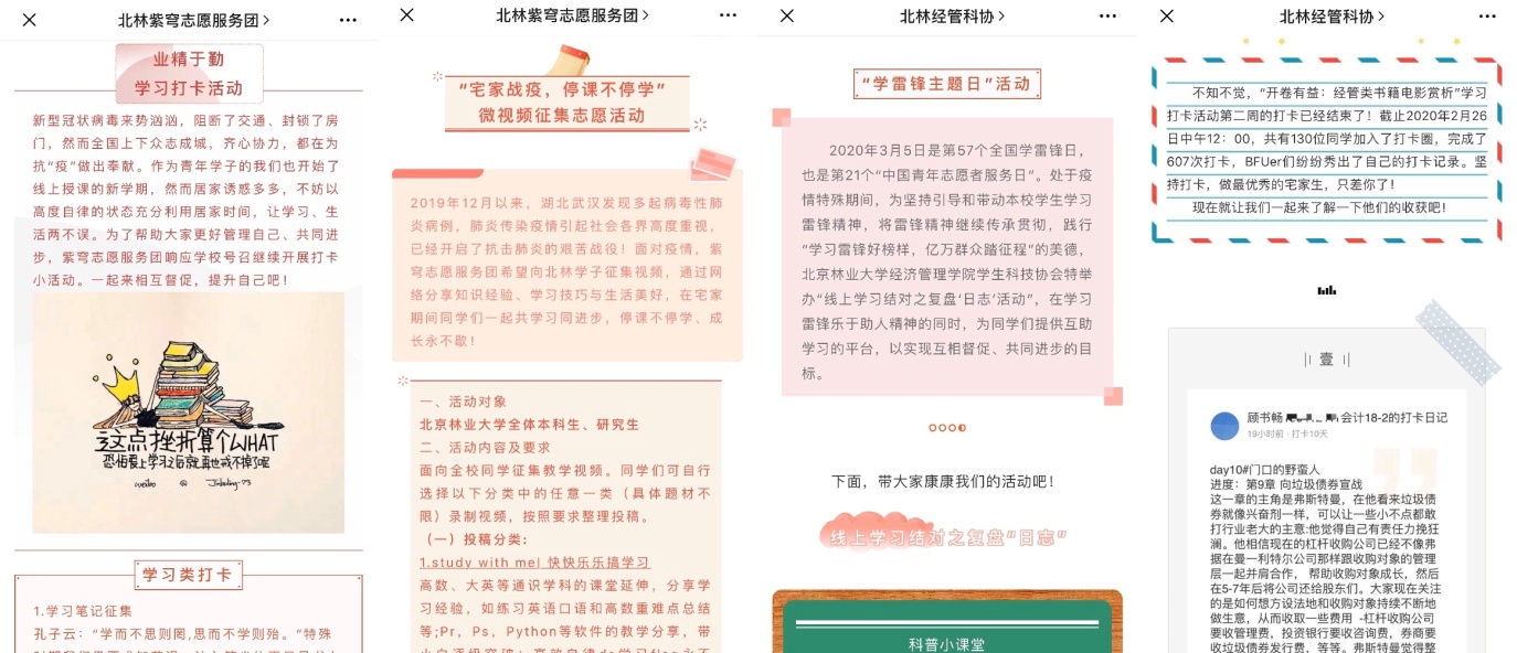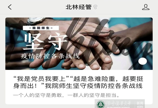 为积极助力打赢疫情防控人民战争、总体战、阻击战,激励广大团学青年爱国、励志、求真、力行,在战“疫”中成长起来,在奉献中成熟起来,经济管理学院以网络思政教育为核心,结合专业特色和团学品牌,组织开展线上专题活动,依托学院青年思政工作室,为大学生线上辅导,解决深层次思想问题,基层团支部积极组织线上生活会,开展主题教育“云”活动,团员青年用行动砥砺青春梦想,贡献北林经管力量。