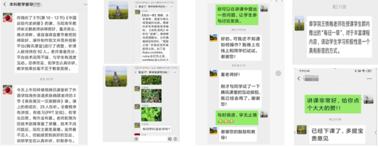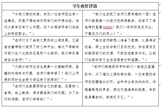 学生感恩教师,积极参与在线互动。学生通过课程微信群、问卷调查等渠道留言,感谢授课教师的辛苦付出,他们真切感受到了教师们为保障在线教学效果所做的努力,尤其是教师每次课前的温馨提醒、授课过程中殷殷教导、课后的真挚关怀,纷纷表示会在家中认真学习,以优异的学习成绩回报学校和教师的关怀。