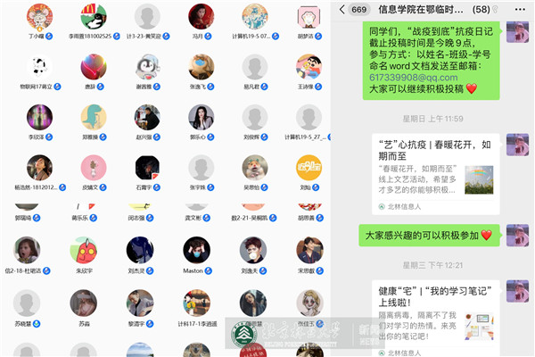 信息学院成立在鄂学生临时党支部和在鄂学生临时团支部,发扬“党有号召、团有行动”的优良传统,全面落实防控责任,筑起抗击疫情的坚固长城。通过线上会议,表达对在鄂同学的关心和慰问,肯定同学们的责任担当意识和积极向上的精神风貌,进一步加强了在鄂同学之间的沟通交流,更坚定了大家团结一心、战胜疫情的信心和决心,让同学们感受到“隔疫不隔爱,封城不封心”。建立在鄂学生微信群,及时传达最新抗疫政策,转发学校、学院相关教学通知、线上活动等。