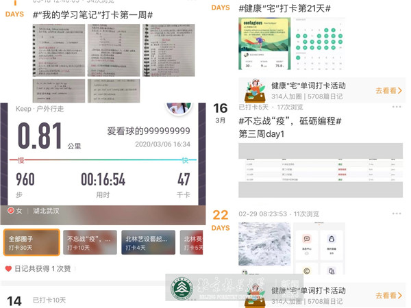 坚持健康“宅”打卡,生活学习两不误。为引导学生拒绝懒散,养成自主自律的学习和生活习惯,鼓励同学相互监督,提升自我要求,信息学院推出一系列健康“宅”打卡活动,包括单词学习、编程练习、思政教育、学习笔记、运动健身、居家打扫等主题打卡,有效促进学生适应居家隔离和疫情防控新形势,在鄂学生积极参与,累计参与打卡500余次。