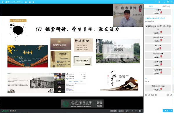牟老师谈到,学生通过线上学习能有所收获、达到教学效果,这是课堂的“有效收视率”,而产生“无效收视率”的原因主要是课程枯燥、无聊、费脑、催眠。结合两个多月的线上教学经验,牟老师提出破解方法——“抖包袱”。他在每堂课中至少设计3-4个小“包袱”,不仅让课程变得有趣、好玩、提神,更让教师的新观点、新思想以及新内涵有效传达给学生,将学生紧“抓”到课堂。牟老师以《中国近现代史纲要》课程为例,指出线上教学要增强吸引力需要做到三点。课程内容要丰满“有料”,让学生有满满的获得感,通过新讲法“用数据讲历史”,让学生保持新鲜感的同时进一步认识、感受和反思历史;“从大历史观角度讲历史”的新思路,让学生将历史看的更清楚、读的更完整、悟的更深刻;“对历史有学术思考”的新解读,让历史更有可信性、更有说服性、更有权威性。 “有趣”的课程要精心设计,让学生有足足的活力感,通过增加课堂研讨、充分准备回应学生问题、使用诙谐幽默的语言等来激发课堂活力。课程要“有味”,针对教学内容就地取材,实现价值引领;善于对比,紧扣历史和现实;利用战“疫”课堂,用学术讲政治,讲好中国故事要有深度,要让学生对国家和民族有深深的认同感。
