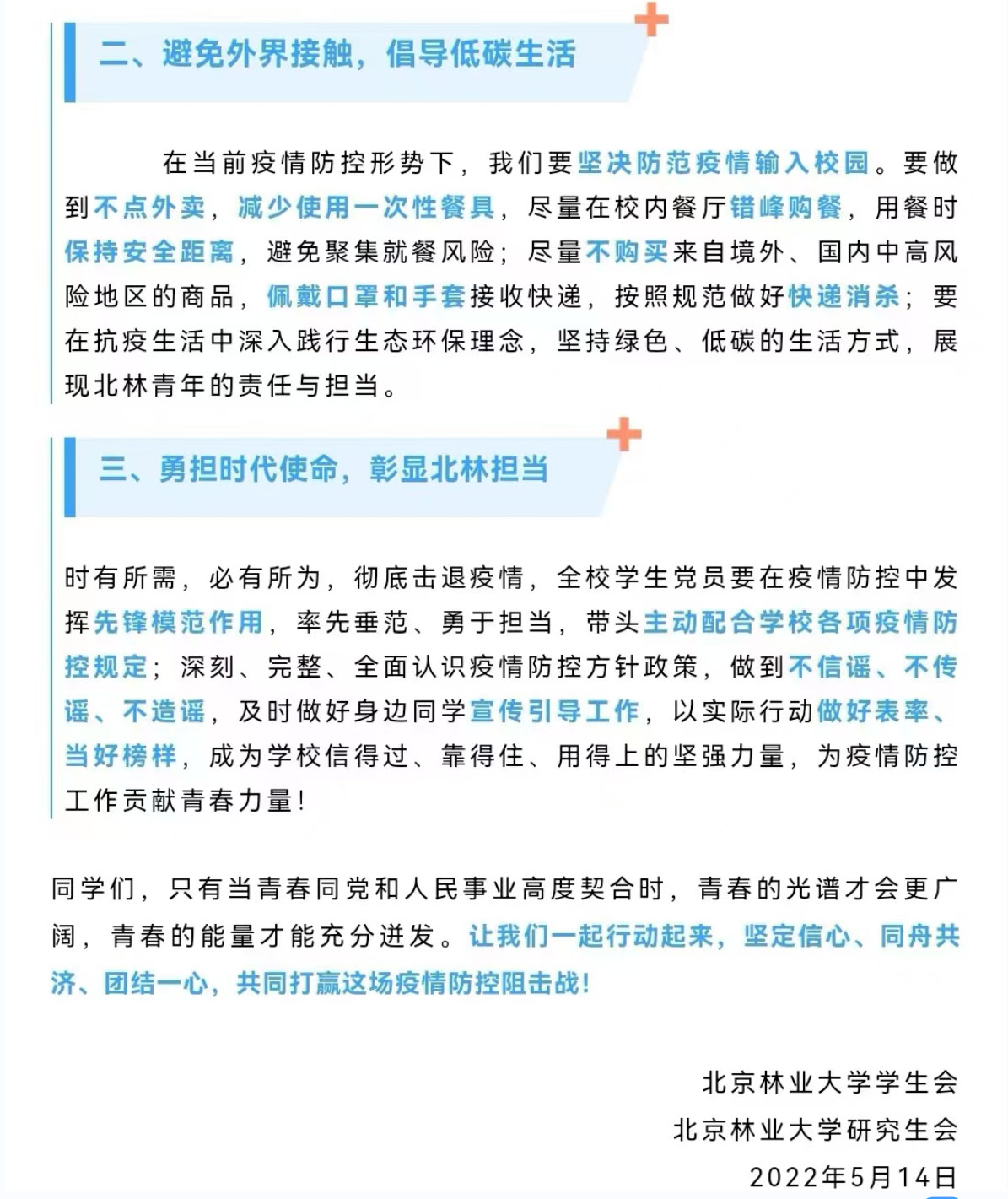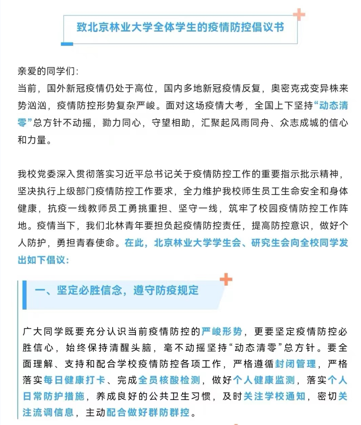我校学生会、研究生会向全体学生发出倡议,号召广大同学坚定必胜信念,遵守防疫规定,坚持每日健康打卡、完成全员核酸检测,做好个人健康监测;避免外界接触,倡导低碳生活,尽量错峰就餐,不点外卖食品,减少购买高风险地区商品;勇担时代使命,彰显北林担当,学生党员要发挥先锋模范作用,加强宣传引导,做好表率、当好榜样。
