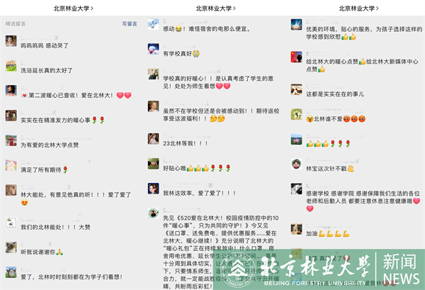 这是继“520”的10件“暖心礼包”仅3天后,学校推出的又10件“暖心事”,这些精准发力、落到实处的疫情防控服务保障工作,让广大师生充分感受到了学校的关心关怀。在校师生纷纷在我校官微评论区留言,“第二波暖心已查收!爱在北林大!” “学校真的好暖心,是认真考虑了师生的意见!处处为师生着想!” “在校师生感谢学校的关爱!”“感谢保障我们生活的各位老师员工!”广大校友和家长则表示,“北林大的暖心礼包持续发放中,真是十分周到具体切实,让人感动不已!在疫情当下,只要情系师生,温暖守护,只要师生同心合力,就一定能战胜疫情,一定会共守云开暖晴,共盼雨后彩虹!”“学校有爱心,家人放心!”还有不少网友表示,希望在未来“北林等我”。