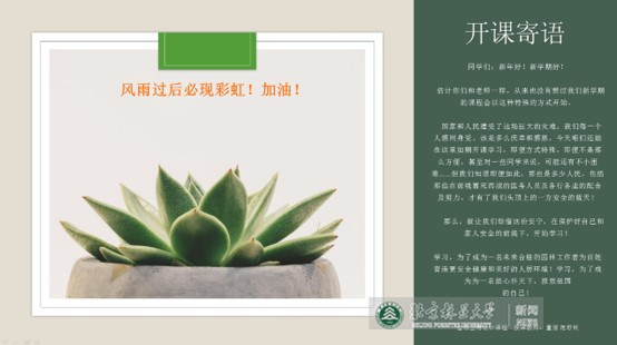是的,正如我2020年2月18日新学期第一次上课时给学生开课寄语上的第一句话一样,我们所有人都不曾想过,2020年的新学期会是以这样一个“特殊、挑战而又难忘”的方式打开。值此举国战“疫”、众志成城的特殊时期,为响应教育部、学校、学院“停课不停教、停课不停学”的重要部署,由我们教研室所承担的《园林植物景观规划》与《园林植物应用设计》两门本科课程也在首周通过网络授课正式开课。回望过去半个月紧锣密鼓的教学准备和开课,感受颇深。