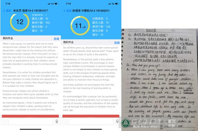 由于用手机开展网课教学,在使用微信上课时切换文档确实有困难,她想了一个“土办法”:把文字稿手抄下来,这样也能标注清楚讲解重点,把自己的思路落实到纸面上,这样在给学生讲课时,能做到心里有数;在探索上课方式时,经过试验和反复思考,她觉得最重要的是把握节奏,时间的衔接非常重要,所以采用了手机录音讲解重点和微信群语音直播的方式,并把每节课的时间节点和讲课步骤记下来,以便于下节课参考或改进;通过课堂提问、外研社U校园学习平台、批改网的配合使用,可以更好地反映学生所思所想,并且提升学生参与度。