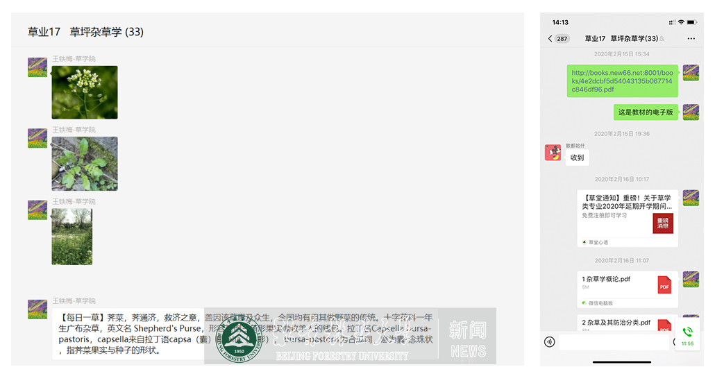 杂草学的实践性很强,同学们需要认识身边主要的杂草。在以往的课程中,王铁梅老师会在上课的路上随时采集一些杂草到课堂上与同学们分享,并适时在校园内开展杂草调查与识别实验实习。现如今,课堂转移到了线上,需要考虑如何弥补线上实践教学的缺陷。王老师就利用微信群,每天与大家分享自己搜集整理杂草图片与简要描述,通过这种方式,使同学们在家也能一直保持学习状态。由于部分同学在家没有课本,为了保证学生们上课进度不落后,除了将电子版的教材发到微信群中外,王铁梅老师在上课前还会将教材拍成照片也发给同学,利用多种方法来保证学生们能有最好的上课资源和学习状态。