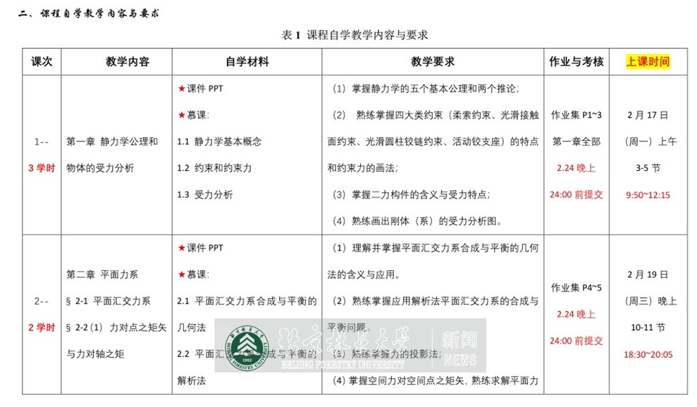 依据教学大纲要求认真撰写了《理论力学课程自学指导书》,明确了每次课的学时、学习内容、学习要求、网上直播上课的时间、课程作业以及提交的时间节点等,如下表1所示。在指导书的“自学材料”一栏中除了给出章节对应的课件PPT名称,还标注了该章节内容与慕课的对应关系,方便学生课下快速便捷地找到对应视频进行巩固学习。在具体教学内容的安排上,也从逻辑层面进行了调整——将原来的“由特殊(平面)到一般(空间)”的知识体系变为“由一般到特殊”,同步修改优化了课件PPT,重新修订了《理论力学作业习题集(静力学)》,使得课程的逻辑关系更缜密,提高了单位学时的效度。修正后的体系也与慕课的章节关系更加匹配,从而更加有助于学生充分有效地利用慕课资源。