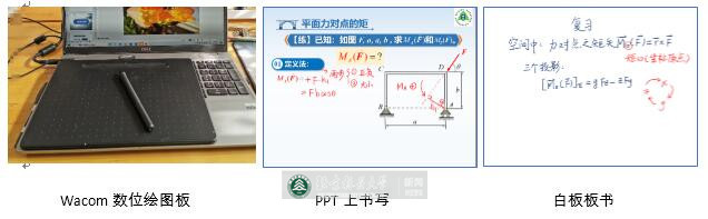 经过比较与分析,最终选用了腾讯课堂作为线上直播平台。为了能实时看到自己上课时学生端的界面,知己知彼随时把控上课的节奏和可能出现的状况,用VGA线将另外一台PC机和电视连线,并用自己的QQ号输入课堂Team ID登陆进入课堂,这样自己就又成了自己的学生,我在大大的电视屏幕上随时可以看到学生的学习界面!同时我还配置安装了外置的带有麦克风的高清摄像头,这样就可以以清晰的面貌与学生见面。鉴于理论力学在实际授课中需要有大量的板书辅助教学,我又购置了Wacom数位绘图板,该绘图板系USB口即插即用,可以实现直接在PPT上进行标记与书写,也可以在PPT页面上调出屏幕白板进行书写,两周来绘图板成了我最得力的助手,它成功圆了我的板书梦,保证了课堂教学的质量。