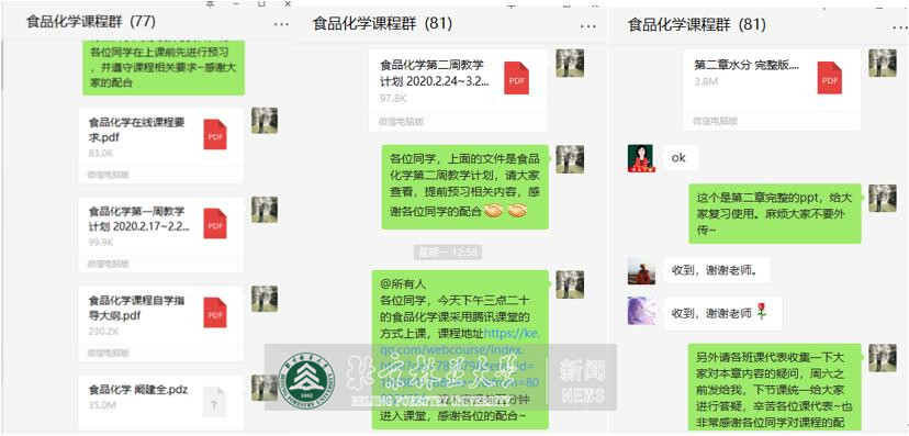 本学期,我与王丰俊老师共同承担食品科学与工程专业核心课《食品化学》的授课工作。面对突发的疫情,根据学校与学院的各项要求,我们第一时间分配了教学内容并制定了课程自学指导大纲;同时建立微信学习群,及时为每位同学提供学习资料;根据授课内容不同,选择了微信群语音授课和腾讯课堂两种授课模式。积极做好各方面的准备,应对在线教学的全面挑战,力保“停课不停教,停课不停学”。