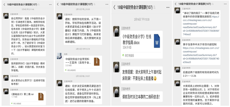 为了更好满足学生学习需求、提升教学效果,王富炜事事想在学生前面。他担心学生们在家缺少学习资料,除了提供《基础会计》复习材料、《中级财务会计学自学指导大纲》以及《中级财务会计学在线教学指南》外,又紧忙联系出版社将教材和配套练习册的电子版提供给学生们。不少学生表示,“王老师的教学材料就像及时雨,在我们毫无头绪时,帮助我们梳理脉络,构建课程知识体系,也能更好地配合好线上教学工作。”在课上,王富炜也不忘再三叮嘱学生们注意保护自己、保护家人,力所能及地履行社会责任。同时结合课程知识将会计职业道德教育融入课堂,引导学生们思考在走入社会后应当坚守的原则。课后,他不时会在微信群内分享案例,鼓励和引导学生们阅读、思考,也会布置各项习题练习保证学习效果。学生们为王富炜在微信群内的“轰炸”各种忙活的同时,也发自内心地感叹他的尽职尽责、用心良苦。