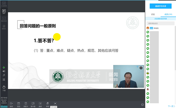 景教授说,在线教学中,无法与学生面对面交流,有效的沟通相比于线下教学难度更高,老师们需要在课前认真准备教学内容,精心策划课程细节,有效掌控课堂节奏,面对学生五花八门的提问,要快速反应,清楚哪些问题要“详尽答”,哪些问题要“简要答”“笼统答”“概括答”;运用好“正面回答”“侧面回答”“反问回答”“无效回答”等技巧,充分发挥教师在教学活动中的引导的作用,做到引领话题,正确导向。