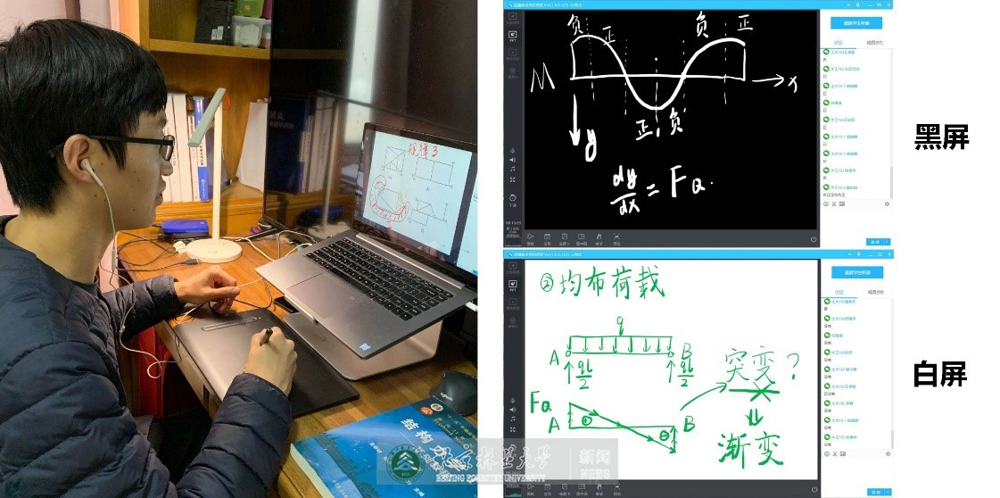 《结构力学》侧重于结构内力、变形的分析,有大量的公式推导和内力图绘制,板书和PPT相互配合已经成为非常有效的教学手段。但线上教学时黑板是奢侈的,在教室直播上课很难实现。有些学生网络条件差,几乎只允许PPT的音频讲解。这种情况下,在“腾讯课堂”中灵活运用PPT的“黑屏”或“白屏”,就能实现黑板的功能,配合教研室专门购置的手写板,板书得酣畅淋漓,知识的讲授几无滞涩。