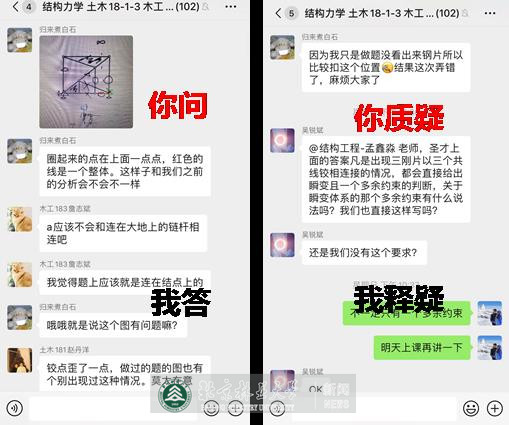 学生远在五湖四海,不能面对面交流,一开始讲课时感觉很怪。利用“腾讯课堂”举手互动,发现每次连接延时都要3-5秒,效果不甚理想。后来改用讨论区,发现延时大幅缩短,基本可以实现实时交流。当把课堂考核简化成只需要两三个字回答的时候,学生积极性提高很多,反馈非常及时。虽然仍听不到学生说话,但看着他们的讨论,仿佛也置身于其中。由于不能当面答疑,学生在微信群里更加活跃了,从一题多解,到质疑参考答案,越来越多的学生能大胆地说出来自己的想法,并且及时得到其他同学的解答,实现了共同学习的目的,“你问我答”的学习氛围愈发浓厚。