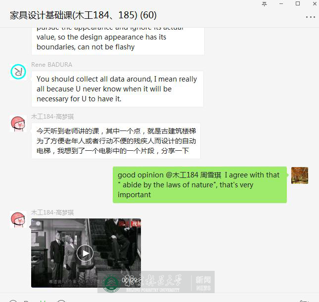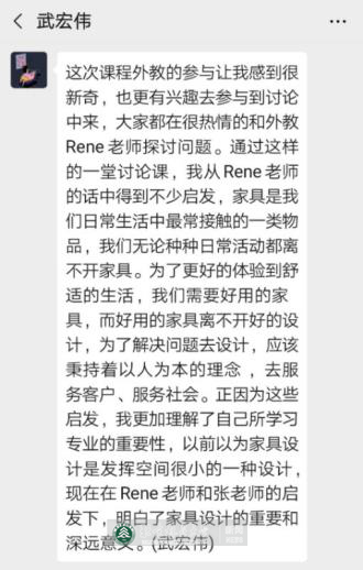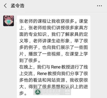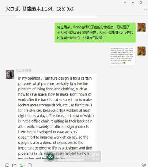 两位教师早在开课之前就在微信群里和学生互动,虽远隔千里,但RENE老师亲切幽默的问候很快让学生消除了紧张感。北京时间2月19日早8点,张帆老师开始了第一节课的教学,并与学生约定了题为“家具的广义与狭义的概念”的晚间讨论。同日晚8点,RENE老师准时在群里发出了第一条讯息:分享他的观点,提出讨论的方向和要求。由此,热烈的在线交流开始了。学生们经过准备,纷纷清晰准确地表达观点。文字、语音、图片、视频、网站链接、共享文件……多种形式,双语并行,丰富而有序。RENE老师和张帆老师也不断进行总结点评,并提出新问题。原定一小时的在线讨论,因学生们的积极参与而一延再延。