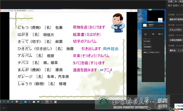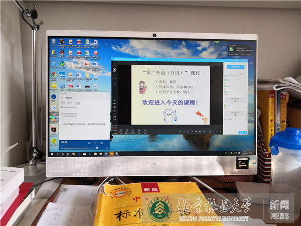 我的第一堂网课是二外日语课,学生有55人,上课的时候,播放PPT、音频视频都很顺畅,和学生也连了麦,做了签到,尝试了答题卡答题,除了学生人数变来变去不稳定,部分学生不能签到、连麦、看不到答题卡等问题以外,课程整体流畅顺利,令人满意。