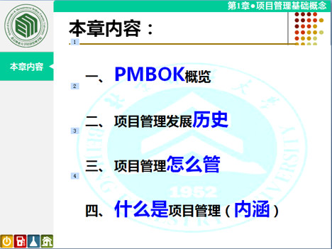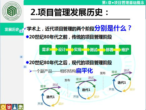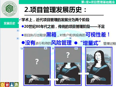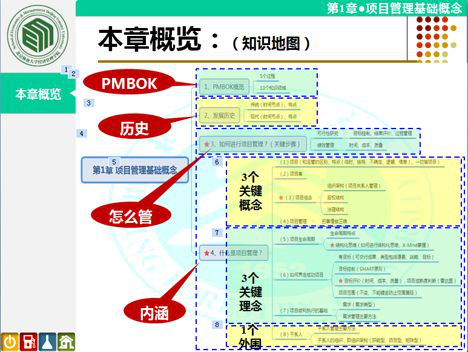 以《项目管理》第一章为例,该章主要讲授项目管理的发展历史、管理特点及概念内涵等理论内容。为了适应目前在线教学的需要,袁畅彦老师将知识架构重塑,并且把重点内容加粗同时引入播放动画;为了更好传递本门课程结构化思维的理念,又引入了以X-Mind为基础的本章知识地图,将具体讲授内容分解并以模块化形式展示给学生。