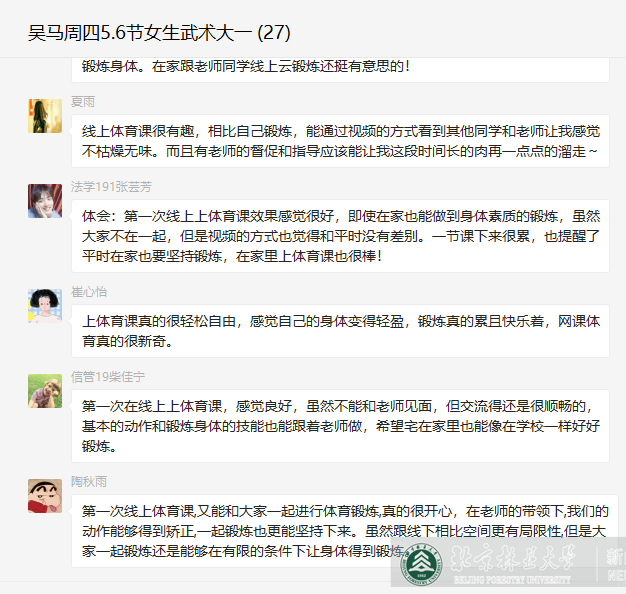 即便是身处家中,我们每天仍需一定时间进行体育锻炼,越是在疫情严重的时候,越是需要强健的体魄。按照体育部要求,学生每天需要进行课外10分钟的自主锻炼打卡,对此,吴马老师认真督促每位同学按时完成锻炼。“10分钟看似很短,但如果认真运动,就能够充分活动身体,带动身体机能的活跃度。每天进行一定量的体育锻炼代替久坐,就是对自己的负责。”吴马老师讲道。