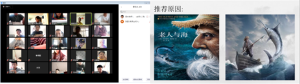 接下来是第三组代表张颖同学介绍的《老人与海》,她的感受集中体现了海明威的人生哲学:我可以被打败,但不会向命运低头;我要保持不服输的斗士精神和积极乐观的人生态度。精彩的发言使同学们沉默、深思许久。家长代表柳畅妈妈从使柳畅同学受教育方面进行点评;我接续从三个方面进行了补充:一是这本书为教育部推荐高考必读书目;二是书中展现出的人与大自然做斗争的不服输精神和乐观态度值得大家在生活中学习;三是国内外小说的艺术发展各有其特点,希望同学们博览群书、博采众长,为我吸收。