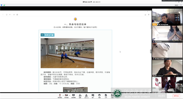 “停课不停学,宅家也锻炼“,北京林业大学倡导同学们在家“运动防疫,主动健康”。从第六周开始,在线体育直播教学也上线了,体育教师在镜头前展现了丰富多彩的教学形式,用身体素质教学带领学生们提高健康体能,用专项直播教学带着同学领略不同专项的居家训练风采,用课外锻炼督促同学们坚持适量的日常健身,保证大学生远离“家里瘫”,共塑健康好身体,提高机体免疫力。