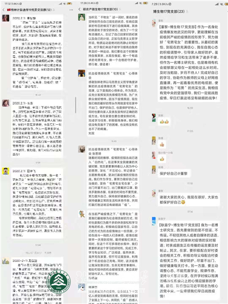 学生第一党支部的张国慧利用所学的专业知识向家人、朋友积极科普病毒相关知识,她说:“疫情中没有谁能够置身事外,每个人都是疫情防控网上的关键一环。只有环环相扣、人人有责,才能及时阻遏疫情蔓延的势头,尽快扑灭疫情的“火焰”。不信谣、不传谣,用科学审慎的“放大镜”,甄别出权威准确有效的信息,我们才能坚定战胜疫情的决心和信心。对于现阶段的我们来说,“不添乱”就是帮忙,“不侥幸”就是负责,“不传谣”就是善意。我们在家就是对疫情防控做出的最大贡献。我也坚信在党中央统一调控下,在全国人民万众一心共同努力下,我们一定会胜利!”