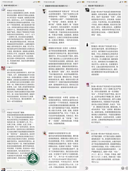 在听完党课后,博生物19党支部的郭洙娟决定每天给自己制定当天的小计划,她说:“新型冠状病毒感染引发肺炎疫情,生命重于泰山。我们在家不出门,不信谣,不传谣,做好居家防控就是在为自己负责,在为国家做贡献,在这个关键时刻,我们不能给国家添乱。但是,宅在家里也不能放纵自己,每天要有规律地学习生活,给自己安排每天的小目标,就像老师讲的超越自我才能更好地实现本我。所以,坚持就是胜利,做优秀的“宅男宅女”,待到春暖花开之时,一定可以看到最好的彼此。”