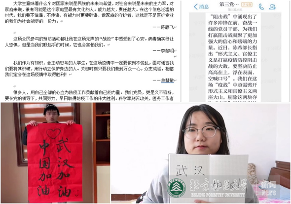 线上,林学院各师生党支部利用网络组织党员开展组织生活,通过微党课、视频会议、微信群分享等形式,认真学习了习近平总书记关于新冠肺炎疫情防控的重要讲话精神、陈宝生部长在教育系统防控视频会上的讲话精神、《教育部致全国大学生的一封信》、《中共北京林业大学委员会致全体学生党员和学生干部的一封信》等内容,纷纷承诺定将严守纪律,做科学的传播者、谣言的粉碎者、健康的守护者和家庭的关爱者。同时,党员、积极分子通过视频分享、微党课分享等宣传疫情防控阻击战中先进的人物事迹,录制加油视频向逆行者致敬。