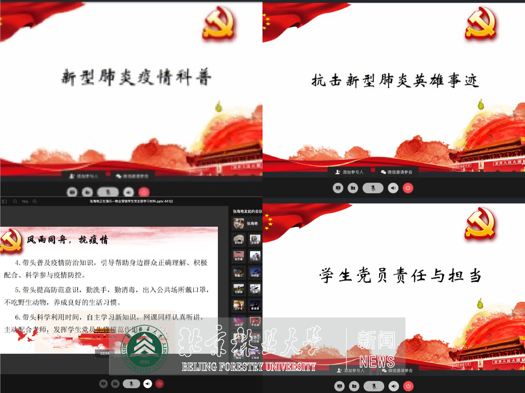 为进一步提高支部成员疫情防控意识,加强思想政治建设,近日经管学院物业营销学生党支部开展了以“众志成城,同心战‘疫’”为主题的线上组织生活。