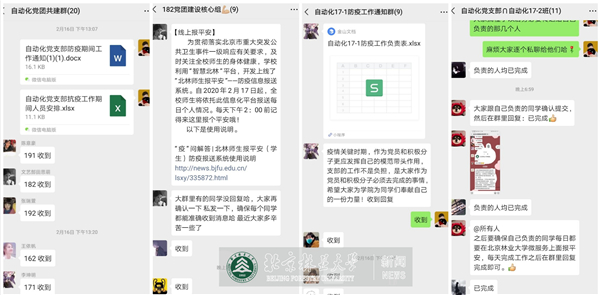 “党员冲在疫情前,一人一亩责任田”活动,号召学生党支部的党员和积极分子,在本班级里划分属于自己的“责任田”,每人负责自己班级中固定的数名同学,在党支部同学自己以身作则积极完成各项工作的同时,将自己承包的“责任田”内的同学通知到位,做到信息上传下达,及时完成学院和学校的工作并上报给本班班级负责人或班主任,解决了往常班级群内通知接龙的低效率问题。