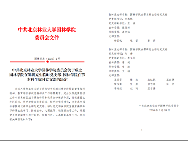 疫情就是命令,防控就是责任,园林学院党委坚持充分发挥基层党组织的战斗堡垒作用和共产党员的先锋模范作用,2月28日成立在鄂本科生临时党支部、在鄂研究生临时党支部,进一步发挥学生党员在防控疫情斗争第一线的榜样引领作用,为打赢疫情防控阻击战贡献力量。