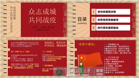2月23日,支部以微党课形式,开展了“众志成城,共同战疫”专题组织生活会。通过“前期自学+线上讲解”的模式,学习疫情防控中党中央的英明决策,优秀党员争做表率和时代青年勇担使命的实际行动。会上,支部党员共同学习疫情防控下习近平总书记的“排兵布阵”,着重学习习近平总书记做出的4项重要指示和8次重要会议的会议精神。