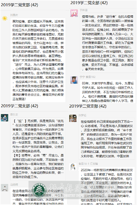 此外,除此之外,支部党员程晓雯制作了“武汉加油”海报,程平用自己积攒下的零花钱参与了抗疫捐款工作。支部党员用不同的方式参与到防控疫情工作中,以实际行动勾勒出“最美逆行者”的姿态。