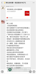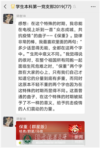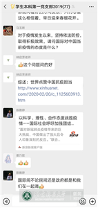 会议首先依托“学习强国”平台进行线上理论知识分享,主要内容包括疫情发生以来中央各项举措、学习强国平台发布的各类文章,党小组结合疫情期间所见所闻发表感想,随后各党小组间针对分享的文章内容以线上问答的形式进行相关知识讨论互动,同时支部成员在支部群分享疫情期间的居家学习感悟,互荐好书,互相勉励。