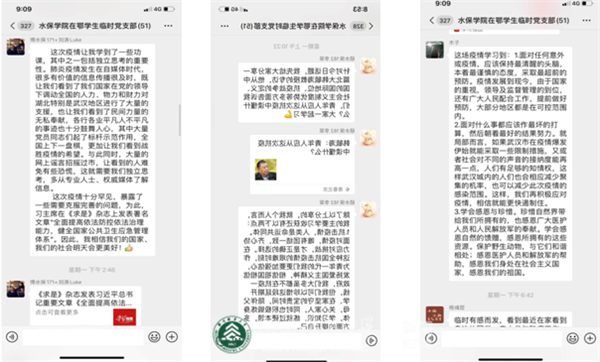 话题发起人硕士生党员李菲通过分享韩毓海教授的文章“青年人应从此次抗疫中读懂什么?”发表学习感想。她说,抗击疫情,人类是命运共同体。作为青年一代的我们要加强信心,弘扬新时代爱国主义精神,相信祖国相信政府,宅家不宅志,强健体魄,学习知识,练就过硬本领,多方面提升自己。不信谣、不传谣,不造谣。青年一代的我们要积极关注国家动态,有独立的思考能力和甄别判断能力,保持正确心态,理智分析,不盲从不偏颇。