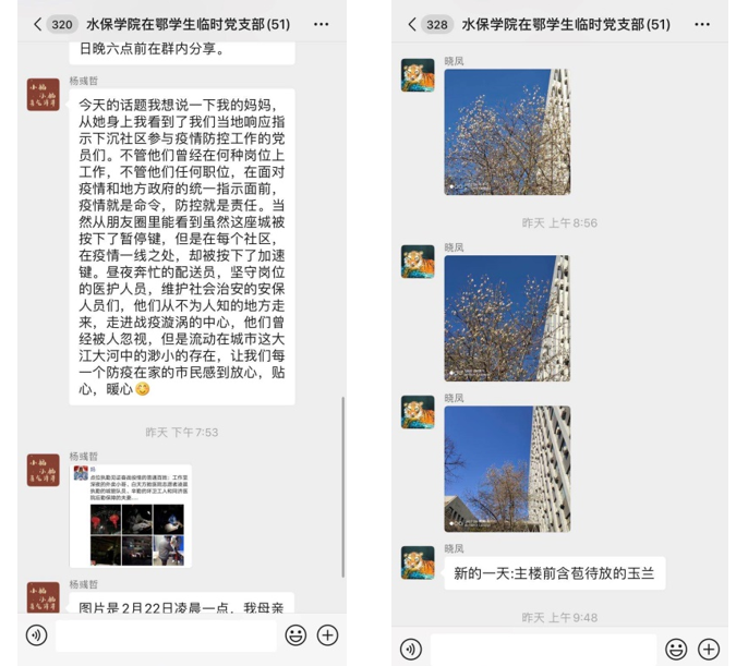 临时党支部的成立,保障了水保学院在鄂学生信息掌握工作的有序开展,建立防控信息小组,督促党员主动掌握本组学生在家身心状态及学习科研情况,摸排疑虑与难处,及时上报学院,协调力量帮扶解决。同时湖北地区学生们能借此媒介进行交流,分享日常见闻、在家防疫生活的体会,感受学校师生的牵挂。