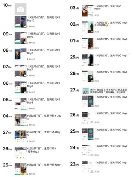 每天适时适量参加体育运动,不仅能增强抵抗力,也可以丰富假期生活。学生第二党支部党员踊跃报名参加生物科学与技术学院组织的“运动战“疫”活动,连续打卡十天室内运动,筑牢必胜信心。