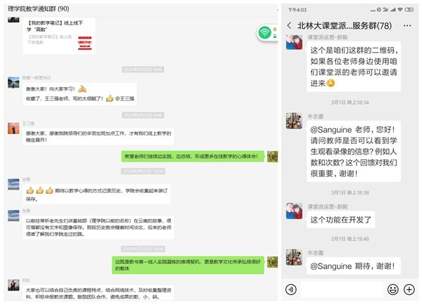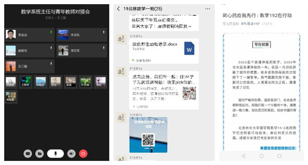 坚持支部凝聚、党员引领,当好在线教学“答卷人”。2月13日,数学支部用企业微信召开“在线教学党员先行,坚决打赢两不停战役”专题组织生活会,认真学习习近平总书记关于疫情防控工作的系列重要讲话精神,对党员全力投入在线教学,积极参与抗疫斗争进行动员部署。全体教师党员一致表示要发挥先锋模范作用,牢牢把握立德树人正确方向,抓实抓好在线教学任务的落实,切实践行初心使命。党支部书记和党员教师带头主动请缨,面向全院教师开展使用企业微信、腾讯会议平台的主题交流分享。支部教师党员将运用数学知识科学看待疫情等思政元素有机融入课程教学,引导同学树立科学精神,理性分析问题;坚持边教学边总结,第一时间撰写多篇在线教学心得并被教发中心推送,为其他教师提供了有益借鉴;发起成立课堂派北林服务群,为教师之间交流分享搭建平台;积极更新教学理念,即时开展学情收集分析反馈,强化教学互动,确保在线教学既见人闻声,更互动促学。截至目前数学系开设的所有课程在线教学开展顺利,学生评价良好。