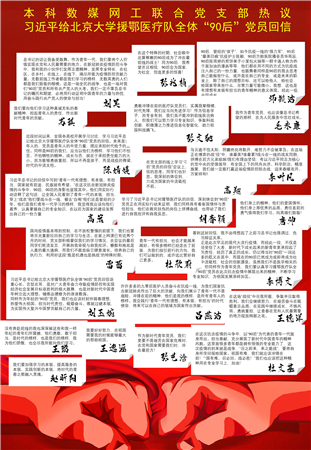 支部党员李博文说:“作为青年党员,我们要认真学习援鄂医疗队全体‘90后’党员在此次抗击疫情中展现出来的精神,不断学习专业知识,为祖国发展添砖加瓦。”