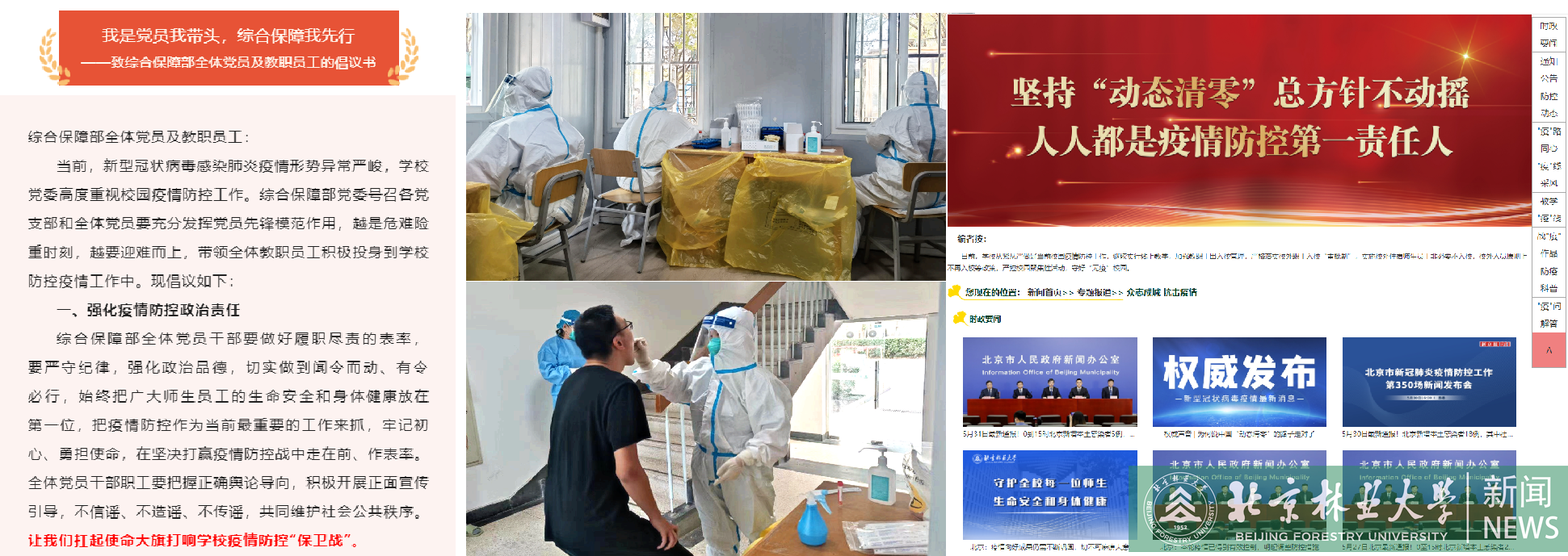 强化宣传动员。各级党组织积极行动,线上线下深入宣传习近平总书记重要讲话和重要指示批示精神,宣传党中央、国务院的决策部署,宣传校党委贯彻落实的有力举措。宣传部党支部第一时间在北京林业大学官微、绿色新闻网报道党中央关于疫情防控的决策部署,宣传市委和校党委工作要求,加强疫情防控政策宣传和师生思想引领。各级党组织通过书记讲党课、开展组织生活等方式,全覆盖开展疫情防控“大思政课”,组织全体党员深入学习党中央“动态清零”总方针,引导师生在封闭管理期间强化必胜信心,凝聚战胜疫情的强大力量。