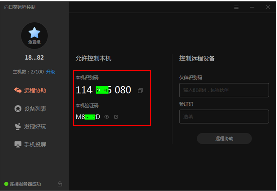 如上图所示,办公电脑只要开启向日葵软件,家庭电脑输入办公电脑的“本机识别码”和“本机验证码”,即可申请访问和控制办公电脑。